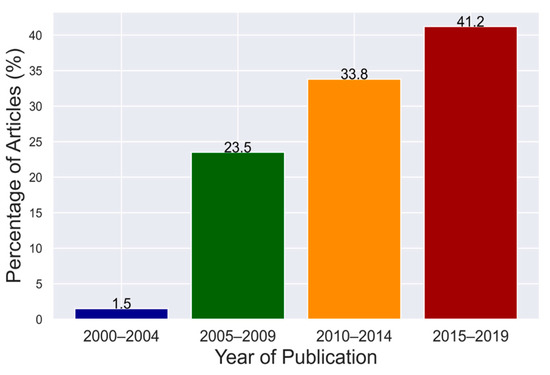 The reviewed articles were published between 2000 and 2019, from 22 sub-Saharan African countries. One article (1.5%) was published between 2000 and 2004, 16 (23.5%) between 2005 and 2009, 23 (33.8%) between 2010 and 2014 and 28 (41.2%) between 2015 and 2019 (Figure 2).