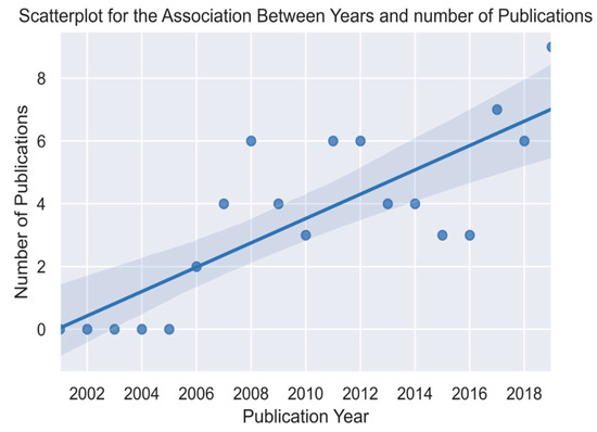 A Pearson correlation was computed to assess the relationship between years of publication and the numbers of articles published. There was a positive correlation between the two variables (r = 0.81, n = 20, p < 0.0001). This shows that there was a fairly strong positive and significant increase in the number of published articles between the years 2000 to 2019 (Figure 3).