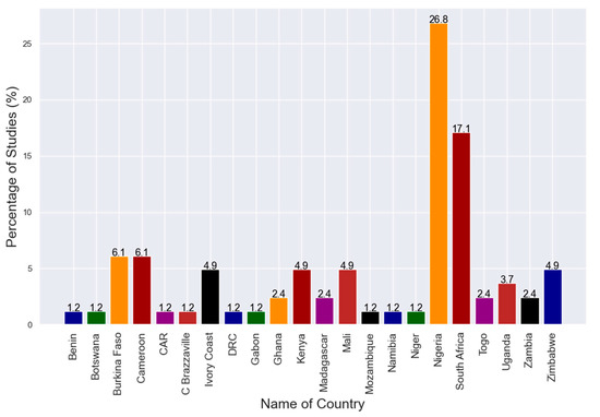 A review of selected publications yielded a total of 83 published records on the presence of avian influenza in sub-Saharan Africa. Most articles (26.8%) were for studies done in Nigeria followed by those in South Africa (17.1%) (Figure 4).