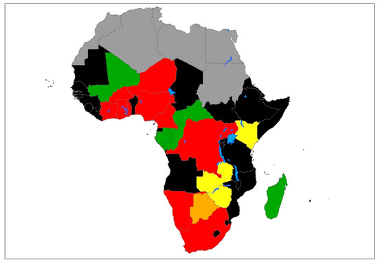Geographical distribution of highly pathogenic avian influenza (HPAI) and low pathogenic avian influenza (LPAI) subtypes in sub-Saharan Africa. Color codes: red denotes countries reporting either HPAI only or both HPAI and LPAI; orange denotes countries reporting H5 or H7, but whose pathogenicity was not determined; yellow denotes countries reporting LPAI; green denotes countries reporting AIV whose subtypes and pathogenicity were not determined; black denotes countries in sub-Saharan Africa with no reports of AIV in birds in the study period; gray denotes North African countries not included in the study; blue denotes major water bodies.
