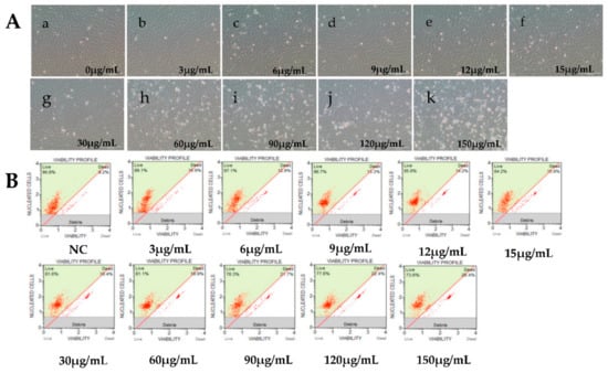Effects of cycloheximide (CHX) at different concentrations on RyuF-2 cell viability. Cells were treated with CHX to inhibit protein synthesis in order to screen for immediately genes. Cell viability was determined under a microscope after 14 h of treatment with the different concentrations of CHX (5~150 μg/mL). (A, a–k), images of cell cultures under various CHX concentrations. (B) Corresponding cell viability graphs.
