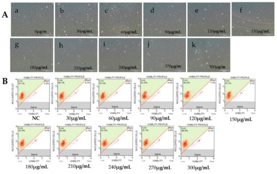 Effects of cytarabine injection (Ara-C) at different concentrations on RyuF-2 cell viability. Ara-C hinders the action of DNA polymerase and inhibits DNA synthesis. Cell viability was determined under a microscope after 14 h of treatment with the different concentrations of Ara-C (0~300 μg/mL). (A, a–k), images of cell cultures under various Ara-C concentrations. (B) Corresponding cell viability graphs.