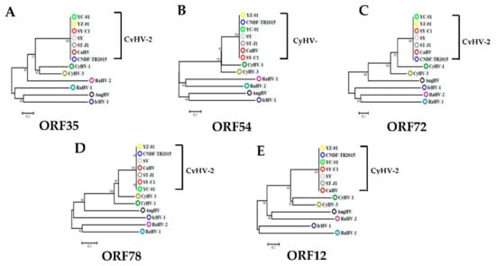 Phylogenetic analysis of five ORFs from CyHV-2. The Phylogenetic trees (A–E) were constructed using the neighbor-joining method in MEGA7 based on five ORFs from CyHV-2 (SY (GenBank accession no. KT387800), ST-J1 (NC_019495), SY-C1 (KM200722), CaHV (KU199244), YC-01 (MN593216)), CyHV1 (NC_019491), CyHV3 (NC_009127), AngHV1 (Anguillid herpesvirus-1; FJ940765), RaHV1 (Ranid herpesvirus-1; NC_008211), RaHV2 (Ranid herpesvirus-2; NC_008210), and IcHV1 (Ictalurid Herpesvirus 1; NC_001493). Branch lengths are proportional to evolutionary distance showing the divergence among different species.