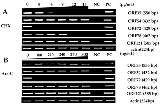 Effective concentration screening of the inhibitors. Gene expression differences of five selected CyHV-2 genes in infected RyuF-2 cells were obtained using Real-Time Reverse Transcription (RT-PCR) under different concentrations of CHX (0 to 15 μg/mL) (A) or Ara-C (0 to 300 μg/mL) (B) treatment. Treatment of infected cells with 12~15 μg/mL CHX or 180~300 μg/mL Ara-C inhibited the expression of certain genes. The gene encoding actin was used as an internal control. NC: negative control; PC: CyHV-2 DNA used as positive control.