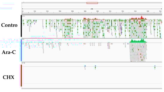 CyHV-2 ORF expression was examined for three groups: the control group (without inhibitor), the CHX (12 μg/mL) treatment group, and the Ara-C (300 μg/mL) treatment group. RyuF-2 cells at eight hours post infection with CyHV-2 were subjected to mRNA extraction followed by RNA-seq analysis, which produced several million high quality reads for each sample (Table 2). The cleaned reads were analyzed and mapped to the CyHV-2 genome. As shown in Figure 6, Table 2, and Supplementary Materials Table S1, all 150 annotated ORFs from CyHV-2 ST-J1 were completely sequenced in the control group, which indicated that CyHV-2 DNA synthesis had been achieved at eight hours post-infection. As expected, fewer ORFs were expressed in the CHX groups compared with those expressed in the Ara-C group (61 vs. 127) (Figure 6 and Table S1). Thus, these 61 ORFs were identified as candidate IE genes in CyHV-2. Table S1 provides detailed information concerning the candidate IE genes.