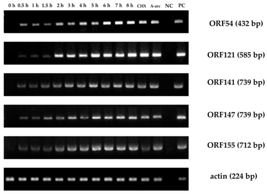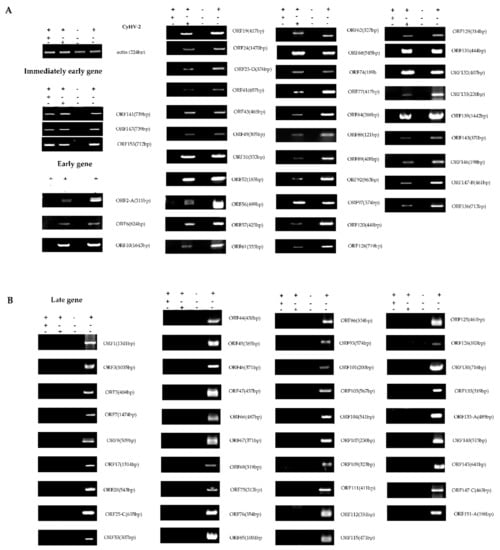 Like many other DNA viruses, herpesvirus genes are classified into three distinct phases: immediate-early (IE) genes, early (E) genes, and late (L) genes. Immediate-early genes play a key role in the regulation of E and L genes. In addition, many IE genes code for regulatory proteins that are essential to regulate the physiological state of the host cell to enhance viral replication []. Fifteen CyHV-3 IE genes were identified using a fibroblast-like cell line as an in vitro infection system together with cycloheximide (CHX) as an inhibitor []. However, among all sequenced alloherpesviruses, twelve genes (ORF33, ORF46, ORF47, ORF61, ORF71, ORF72, ORF78, ORF79, ORF80, ORF90, ORF92 and ORF107 referred as core genes) are conserved significantly []. The expression order of the open reading frames (ORFs) identified in CyHV-2 remains unknown.
