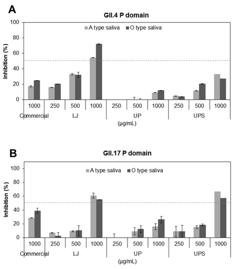 Inhibition of binding of the P domains of human norovirus (HuNoV) GII.4 (A) or GII.17 (B) to A- or O-type saliva by the fucoidans of Laminaria japonica (LJ), Undaria pinnatifida (UP) and Undaria pinnatifida sporophyll (UPS). Inhibition was quantified by ELISA using anti-NoV antibodies against GII.4 and GII.17 P domain. A commercial fucoidan (≥95% purity) was used as a positive control. The dashed line indicates 50% inhibition.