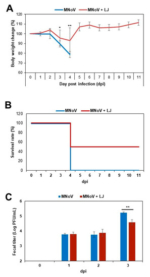 In vivo efficacy of fucoidans of Laminaria japonica (LJ). (A) Body weight changes, (B) survival rate until 11 dpi and (C) fecal viral titers. STAT1−/− mice were inoculated perorally with 3 × 104 PFU of MNoV and a dose of 40 mg fucoidan/kg/day (n = 4 per group) was administered by oral gavage immediately after infection until 4 days post-infection (dpi). A PBS group was used as control. Asterisk indicates significant difference (* p < 0.05; ** p < 0.01).