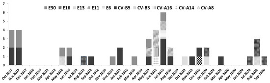Enteroviral infections seem to have tissue tropism and different genotypes are associated with various clinical manifestations [35]. During the study period, there was not any identification of EV-A71 and EV-D68, which are associated with severe neurological manifestations such as acute flaccid myelitis [36,37]. The characterization of emerging EV subtypes which are associated with unusual clinical presentations could help elucidate epidemic outbreaks or document new genetic variants with high virulence.