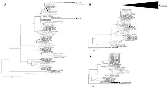 Phylogenetic trees of E30 (A), CV-B5 (B) and E16 (C) strains of this study with other global reference strains based on a part of 308, 274 and 295nt of the VP1 gene, respectively. Greek strains of this study are indicated with a filled black triangle. Outgroups are indicated by name and accession number from GenBank. The rest of the reference strains are labeled with the accession number, 2 or 3 letters of the country of origin and the year of isolation. The neighbor-joining method and bootstrap test of 1000 replicates were used to infer the phylogenetic trees. Only percentage values of replicate trees above 70% are shown next to branches. Notes: GRC = Greece; HOL = Holland; POL = Poland; DE = Germany; FRA = France; ITA = Italy; UK = United Kingdom; BG = Bulgaria; AUS = Australia; RUS = Russia; CHN = China; THA = Thailand; PAL = Palestine; IRI = Iran; ETH = Ethiopia.