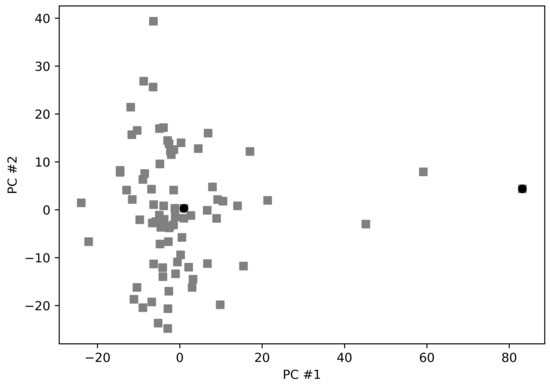 Molecular docking is a method which predicts the mutual orientation of molecules when bound to each other to form a stable complex. This method can be used to predict the binding affinity of small ligands to a target protein by means of appropriate scoring functions. These (empirical) scoring functions contain a set of parameters which describe what are the most important properties in determining the binding affinity between the ligand and the receptor (i.e., the protein target). These scoring functions generally describe polar–apolar interactions, interaction entropy, desolvation effects, van der Waals interactions (by Lennard–Jones potential), and electrostatic interactions. Since the availability of fast scoring functions, molecular docking has become an important piece of the modern drug discovery toolbox. From a general point of view, it is necessary to pay particular attention to the strategy to be used for docking. The docking target must be a sufficiently representative structure: proteins are in fact extremely dynamic entities and this aspect must be taken into due account. In principle, protein dynamics can be considered by using a flexible target in the docking program, but this strategy exposes to the risk of over fitting, which leads to overestimate binding affinity. Our approach was therefore based on the use of different protein conformations such that the structural landscape of the protein of interest was sufficiently represented. Each of these representative conformations was then used to perform independent docking experiments in silico. A very efficient method to evaluate if different protein conformations are accessible to the protein of interest is to carry out the principal component analysis (PCA) on the protein structures available in the Protein Data Bank (PDB). Of course, this technique can only be used if a sufficient number of entries for the protein of interest are available. Fortunately, thanks to the international effort of structural biologists and crystallographers, an impressive number of SARS-CoV-2 has been obtained. A detailed structural analysis on the conformational landscape of based on a series of structures available in the PDB has already been reported elsewhere by one of the authors and will not be repeated in detail here [12]. We recall only the most interesting point for the purposes of the present work, namely that the structures are grouped in a single cluster from which some outliers detach along the first principal component (Figure 1).