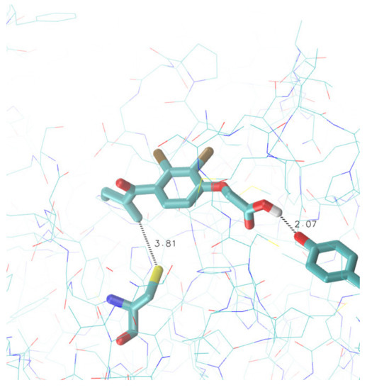 These search criteria led to the identification of two compounds. One of these is boceprevir, with a binding affinity (regardless of the covalent bond) of −7.0 kcal mol. This compound has not been further analyzed because is a known inhibitor of with an = 8.0 M [45]. The other compound identified in this study is the ethacrynic acid (IUPAC name: 2-[2,3-dichloro-4-(2-methylidenebutanoyl)phenoxy]acetic acid), an unsaturated ketone derivative of aryloxyacetic acid belonging to the class of loop diuretics. This molecule is able to bind to the active site of with a calculated binding energy of approximately −6.0 kcal mol. Although the value of the bond energy is at the lower limit that we had imposed as significant for a specific bond, it must be considered that ethacrynic acid has a rather modest molecular weight (303.13 g mol). So, given the size of the molecule, the observed binding affinity value was suggestive of a specific interaction. In fact for a molecule of this size, in our set up, docking performed on randomly chosen regions of a randomly selected protein (a non-specific interaction) results in a calculated binding affinity approximately equal to (at most) −3.5 kcal mol. The analysis of the obtained poses revealed that the interaction between and the ethacrynic acid is interesting. The -unsaturated region of the molecule is often located at a distance of less than 4 Å from the sulfur atom of the Cys 145 in the active site of the enzyme. Moreover in these productive poses an interaction (hydrogen bond) between the carboxylic group of the ethacrynic acid and the aromatic hydroxyl group in Tyr 54 can be observed. This last residue participates in the formation of the active site. These interactions are shown in Figure 2.