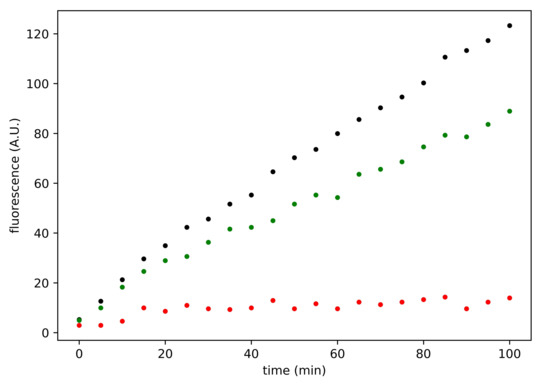 Time course of the SARS-CoV-2 enzymatic activity at some inhibitor concentrations. Black, green and red dots represent positive control, 3.125 M and 100 M ethacrynic acid, respectively. Reported traces are the average of three experiments.