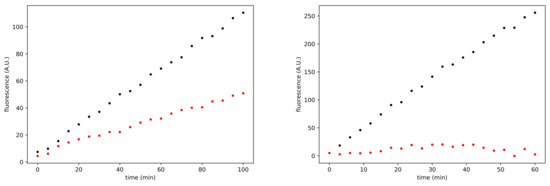 Time course of the SARS-CoV-2 enzymatic activity. Left panel shows the enzyme activity in the DTT-containing reaction medium; black and red dots represent positive control and 100 M ethacrynic acid, respectively. Right panel reports the enzyme activity in the DTT-free reaction medium; black and red dots represent positive control and 100 M GC376, respectively. Reported traces are the average of three experiments.