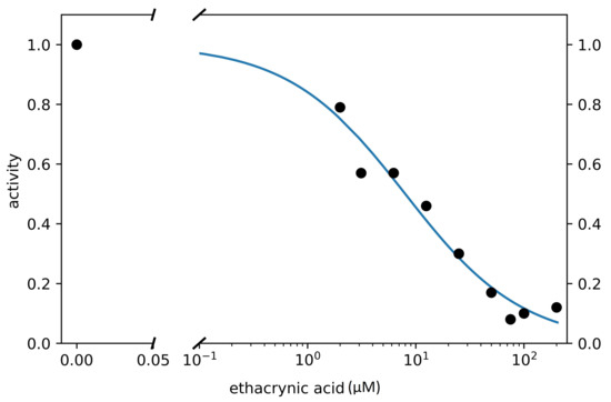 The ethacrynic acid inhibition assay on . Circles represent the mean of at least three independent replicates. Hill-type fitting curve described in the main text is also reported.