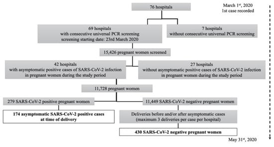 Our study has various strengths: in particular, a prospective screening program with a well-designed database which allowed us to record many characteristics of this novel infection. We evaluated outcomes during the antenatal period, at delivery, and during the postpartum six-week follow-up, in a uniform way for both the infected cohort and the uninfected comparison group. The SARS-CoV-2 negative comparison group was selected from the same centers where the infected mothers delivered and within the same timeframe so as to have similar conditions, thereby minimizing selection and performance biases. Both groups were well defined: more than one-third of the SARS-CoV-2 positive patients were antenatally admitted for observation, and every study participant follow-up was completed 6-week postpartum, allowing us to exclude mothers who became symptomatic after birth. We are therefore confident about establishing the asymptomatic status of mothers in the study. Multivariable analyses allowed for control of confounding variables included in the model. We acknowledge as a limitation the absence of the complete screened cohort; thus, our study has a hybrid design comprised of a prospective cohort of cases, with controls delivered immediately before and after each asymptomatic infected mother, representative of our population. The PCR negative comparison group was a subsample of the screen-negative cohort from all 42 hospitals that had PCR positive asymptomatic mothers. However, the concurrent method applied for the selection of a noninfected cohort allowed for a comparison unaffected by the difference in time of exposure and outcome assessment. We believe our findings are trustworthy, and the multicenter nature of the study adds to its generalizability.