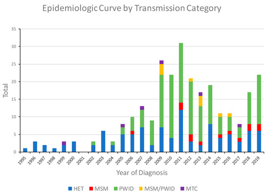 - Campbell, E.M.; Jia, H.; Shankar, A.; Hanson, D.; Luo, W.; Masciotra, S.; Owen, S.M.; Oster, A.M.; Galang, R.R.; Spiller, M.W.; et al. Detailed Transmission Network Analysis of a Large Opiate-Driven Outbreak of HIV Infection in the United States. J. Infect. Dis. 2017, 216, 1053–1062. [Google Scholar] [CrossRef]