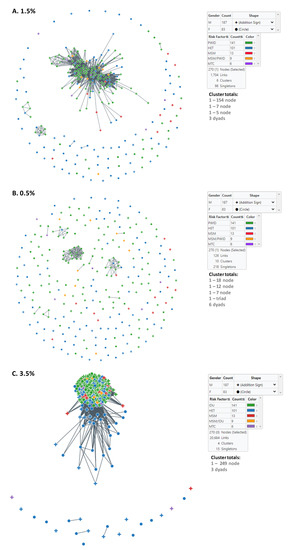 Inference of subtype CRF01-AE clusters in Bulgaria using MicrobeTrace. (A) Six clusters were identified using a genetic distance (d) of 1.5% compared to (B) ten clusters at d = 0.5%. Sex is indicated by circles (male) and addition sign (female). (C) Transmission network at d = 3.5%. Transmission category is indicated with color (red, men who have sex with men (MSM); green, persons who inject drugs (PWID); blue, heterosexual (HET); gold, persons reporting both MSM and PWID; purple, mother-to-child (MTC). Cluster totals by node (members) and total number of links in the transmission network is provided.