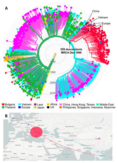 In order to reconstruct the potential origin of CRF01_AE in Bulgaria, we conducted a global phylogenetic analysis of HIV-1 CRF01_AE sequences. Our overall CRF01_AE phylogenies, MRCA divergence dates, and evolutionary rate results from the Nextstrain analysis are consistent with those in the literature, including studies using complete genomes, providing strong support for our findings [8,41,42,43]. Phylogenetic analysis showed that after leaving Africa, CRF01_AE spread to and grew rapidly in Southeast Asia, including Thailand and Vietnam and then to China [5,8,44]. From Southeast Asia CRF01_AE spread to other countries, including Bulgaria. Our analysis inferred two different Bulgarian phylogenetic groups, including a large outbreak clade of 248 Bulgarian pol sequences mostly from PWID. Near the root of the outbreak clade were sequences from Vietnam and China with the Nextstrain analysis inferring Vietnam as the potential origin of the other sequences in the outbreak clade. Our analyses support our previous findings using smaller numbers of both Bulgarian and Asian sequences [13] and likely reflect the international employment agreement between Bulgaria and Vietnam in 1980 and 1990 for Vietnamese workers to come to Bulgaria and which overlaps with the inferred MRCA between 1988 and 1990 for the outbreak clade. These Vietnamese immigrants lived mostly in the capital city of Sofia where the majority (60.7%) of the CRF01_AE cases were diagnosed. A total of about 35,000 Vietnamese immigrants were estimated to be in Bulgaria from 1980 to 1991, but most returned to Vietnam in 1991 after Bulgaria became an independent democracy in 1991. Combined, these results and historical information suggest a possible introduction of CRF01_AE into Bulgaria from Vietnam immigrants between 1988 and 1990 with subsequent rapid transmission via PWIDs, which is similar to other recent global outbreaks [35,36,45,46,47,48].
