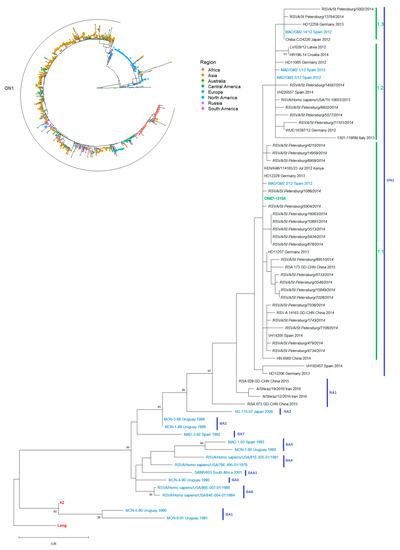 Phylogenetic trees by G gene sequence, St. Petersburg RSV-A isolates, 2013–2014 epidemic season. Radial tree (1491 sequences from GenBank) with a focus on geographic distribution. Rectangular tree with reference strains for each genotype colored in blue; original Canadian reference virus (ON67-1210A)—green; progenitors of RSV-A (Long and A2 strains) colored in red.