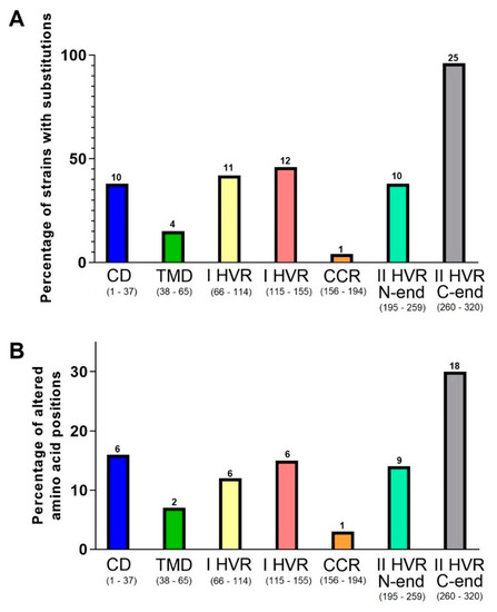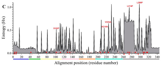 Surprisingly, the cytoplasmic domains of the investigated viruses had a significant degree of variability. In nine strains (33.3%), five positions showed variation of 1–2 aa residues (T4P/N, K5Q/H, Q7P, R8H, K11R). The sequence variability of this region is also observed in the large GenBank dataset (see Figure 2C) and supported by sequences obtained by using different technologies. Currently, there is no literature data about substitutions in this region, as identified in our isolates. Despite the fact that this region is not exposed on the cell surface, it contains B cell epitopes, mutations in which can affect G protein’s antigenic characteristics. For instance, mutations L33P and L35P led to RSV-A being unable to interact with neutralizing monoclonal antibodies [31].