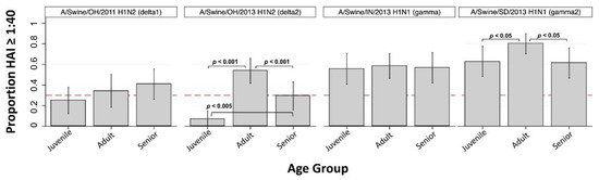 Virus-specific seroprotection rate (SPR) and geometric mean HAI titer (GMT) are shown for juveniles, adults, seniors, and overall in Table 2 and Table 3, respectively. H1-subtype IAV-S were associated with overall SPRs ranging from 32.2% to 65.4% and overall GMTs ranging from 17 to 58. Overall GMTs for A/swine/OH/2011 (H1-δ1) and A/swine/OH/2013 (H1-δ2) were 17 and 18, respectively, and overall SPRs were 32.2% and 33.3%. SPRs for A/swine/OH/2011 (H1-δ1) were below 41% for juveniles, adults, and seniors. The juvenile SPR < 30% indicates TIPRA risk classification as “lower risk” for this H1-δ1 IAV-S. However, the adult SPR was near the 30% cutoff and if the lower 95% confidence interval (CI) of the adult SPR is considered this virus is elevated to “moderate risk” classification (Table 2). The juvenile SPR was 7.0% for A/swine/OH/2013 (H1-δ2), significantly lower than the adult SPR (53.8%, p < 0.001) and senior SPR (29.5%, p < 0.005) (Figure 1). This H1-δ2 IAV-S was thus classified as “lower risk” based on the within-group SPRs < 30% (Table 2). While the senior SPR was <30% for this virus and significantly lower than the adult SPR (p < 0.001), this did not impact risk classification.