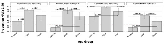 The GMT against A/swine/NE/2012 (H3 cluster IV-F) was 60, and the overall SPR was 63.3%. Seroprotection rates were significantly lower in seniors (59.1%, p < 0.001) and juveniles (39.5%, p < 0.001) compared to adults (87.7%), and the juvenile SPR was significantly lower than the senior SPR (p < 0.05) (Figure 3). This virus was also classified as “lower risk” based on within-group SPRs (Table 2). The GMT against A/swine/OH/2016 (H3 human-like) was 78, and the overall SPR was 69.1%. Seroprotection against this virus was significantly higher for juveniles (86.4%) compared to adults (69.2%, p < 0.05).