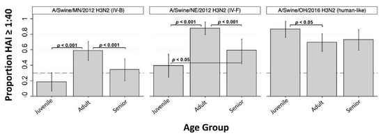 Seroprotection rate (SPR) against H3 cluster IV-A IAV-S by age group (n = 3). Bar height indicates proportion of individuals with HAI antibody titer >1:40, which is the seroprotection rate (SPR) within Juvenile (<18 years old), Adult (18 to 49 years old), and Senior (≥50 years old) age groups. Dashed red line at y = 0.3 corresponds to SPR of 30%. Vertical spikes and caps indicate 95% confidence interval of the proportion. Significant difference in proportions between groups are indicated (when present) by horizontal brackets and p-values (Pearson’s chi-squared).