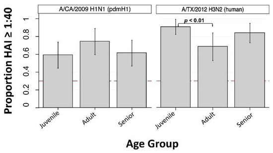The overall GMT against the human seasonal IAV A/CA/2009 (H1-pdm) was 49, and the overall SPR was 62.2%. No significant differences in SPR were observed between age groups for A/CA/2009 (Figure 4). The GMT against the human seasonal IAV A/TX/2012 (H3-human) was 104, and the SPR against this virus was 73.3%. Seroprotection against A/TX/2012 (H3-human) was significantly higher in juveniles (90.9%) compared to adults (68.6%, p < 0.01) (Figure 4).