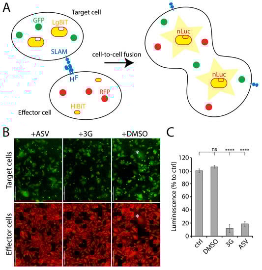 Provided that previous screens involving reporter protein-expressing recombinant live-viruses resulted in the discovery of anti-F or anti-L inhibitors [24], we investigated the possibility to increase the chances to identify novel antivirals by designing a more viral protein-targeted bioassay. We therefore established a quantitative cell-based fusion assay (potentially targeting viral cell entry and spread), which relied on the stable expression of the H, F and SLAM glycoproteins. Two cell lines were generated, namely effector and target cells. While effector cells (Vero) expressed CDV F- and H-proteins (Onderstepoort strain), target cells expressed the receptor only (Vero-cSLAM). Next, the split nanoluciferase (nLuc) system (Promega) was employed to generate a quantitative assay. Indeed, each part of split nLuc (HiBiT and LgBiT) were introduced into effector and target cells, respectively (Figure 1A). Moreover, in order to rationally control for CDV F and H expression, both glycoproteins’ cytosolic tails were fused to a tag, which allowed for protein expression-control (small molecule-assisted shutoff (SMASh) technology [25]). Briefly, by treating protein-expressing cells with the small molecule Asunaprevir (ASV), target protein-degradation is induced [25]. In summary, the assay relied on mixing effector and target cells together in absence of ASV, and 24 h later, to record the nanoluciferase (nLuc) activity. Thus, nLuc activity relied on productive F/H/SLAM interactions. Such glycoprotein engagements ultimately led to membrane fusion promotion (Figure 1B), which in turn triggered cytosolic content-mixing and, finally, nLuc reconstruction.
