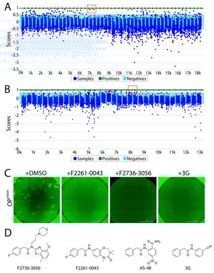 High-throughput screening of small molecules from the two independent libraries. (A) Laboratory Information Management System (LIMS) plot showing the result of small molecule screening from the CDC library. The positive control is normalized to have a score of 1 (equivalent to 100% inhibition) and the negative control is normalized to have a score of 0 (equivalent of 0% inhibition + 100% activity). While the Y axis displays the value of each data point relative to the controls, the X axis illustrates the samples screened (in duplicates). Green dots indicate the positive control (i.e., 3G); sky blue cyan dots represent the negative control (DMSO); dark blue dots show the compounds screened. Red dots in the red box indicate the selected top hit (in duplicates). While the light blue window represents the 3 standard deviations of the negative controls, the green window is the equivalent for the positive control. (B) LIMS plot showing the result of screening from the protein–protein interaction (PPI) library. Red dots in the red box indicate the selected top hit (in duplicates). (C) Infection inhibition analyses. Vero-cSLAM cells were infected with OPneon/nLucP at a multiplicity of infection (MOI) of 0.04 either in absence or presence of either F2261-0043 or F2736-3056 (30 µM). (D) Structures of the compound F2736-3056, F2736-3056, AS-48 and 3G. Scale bars: 2000 μm.