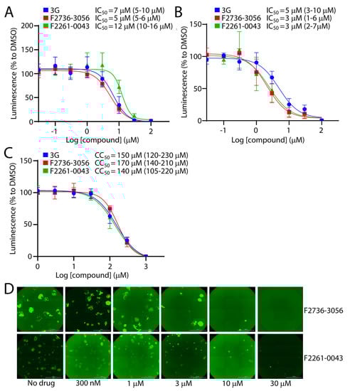 Among the 60 tested compounds, F2736-3056 and F2261-0043 emerged as the most potent inhibitors of CDV infection. In order to accurately determine the efficiency of both small molecule compounds, we compared the bioactivity of these two inhibitors with 3G, which represents one of the most active derivatives of the AS-48 class compounds against CDV [22]. The compounds’ inhibition and cytotoxic impacts were assessed in Vero-cSLAM cells infected with OPneon/nLucP (a recombinant virus expressing both the mNeonGreen and the nanoluciferase (nLucP) reporter proteins). While the 50% inhibition concentration (IC50) of compound F2736-3056 and F2261-0043 returned values of about 5 µM and 12 µM (Figure 3A), respectively, the 50% cytotoxic concentration (CC50) was about 170 µM and 140 µM (Figure 3C), respectively. Overall, while the selectivity index (SI) of compound F2736-3056 and F2261-0043 was about 34 and 12, the SI value for 3G was about 21. Indeed, 3G returned IC50 values of 7 µM and CC50 values of 150 µM (Figure 3A,C). Additionally, the inhibitory activity of the compounds was confirmed against a prototype wild-type CDV strains, namely A75/17, which is genetically distant from the OP-CDV strain. The compounds were also active against A75/17neon/nLucP, a recombinant wild-type virus expressing both, the mNeonGreen and nLucP reporter proteins (Figure 3B) (SI value for 3G: ~30; SI value for F2736-3056: ~56; SI value for F2261-0043: ~46).