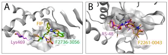 Due to the lack of CDV F-structures in complex with ligands, we used the co-crystal structure of MeV F with AS-48 (PDB-ID: 5YZC) to investigate a potential docking mode of the two newly identified compounds. Interestingly, the docking models illustrate that F2736-3056 and F2261-0043 bind to the same hydrophobic region within the prefusion F-structure (Figure 5A,B). The 2-phenylacetanilide scaffold has been investigated in the past with AS-48 [19] and 3G [22] as prominent representatives. The structure activity relationship (SAR) of this scaffold showed a low tolerance for substitutions on the phenylacetic acid moiety. According to this SAR, the para fluoro substitution is the only tolerated substitution on this phenyl ring, which is consistent with the para fluoro substitutions of the newly identified hits F2261-0043 and F2736-3056. The seven-membered ring of F2261-0043 is placed in the shallow groove, which offers enough space for the additional fused ring (Figure 5B). The benzothiazole moiety of F2736-3056 was placed in the hydrophobic groove as the aniline moiety of AS-48 and the Z-group of FIP. The morpholine moiety is pointing towards the pocket occupied by the L-Phe side chain of FIP. The more polar morpholine is not entering into the hydrophobic pocket but the ether oxygen might form a hydrogen bond to the lysine residue at position 469 (the homologous amino acid in CDV F corresponds to the lysine residue at position 581) (Figure 5A). Collectively, our in silico approach with the two new hits indicated a potential overlap of the binding region with FIP and AS-48 in the previously experimentally determined co-crystal structures [31].