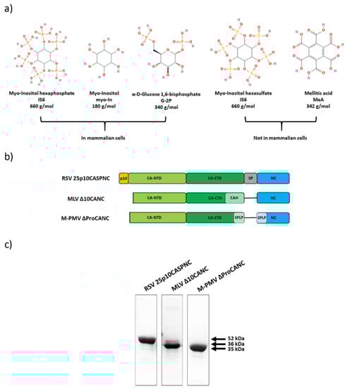 Gag-derived CANC proteins of Rous sarcoma virus (RSV), murine leukemia virus (MLV) and Mason-Pfizer monkey virus (M-PMV) used in this study. (a) Chemical structures of the used polyanions: myo-inostol hexaphosphate (IP6), myo-inositol (myo-In), glucose-1,6-bisphosphate (G-2P), myo-inositol hexasulphate (IS6) and mellitic acid (MeA). (b) Schematic representation of CANC proteins of RSV, MLV and M-PMV. (c) Coomassie blue-stained SDS-PAGE gel, documenting the purity of the proteins.