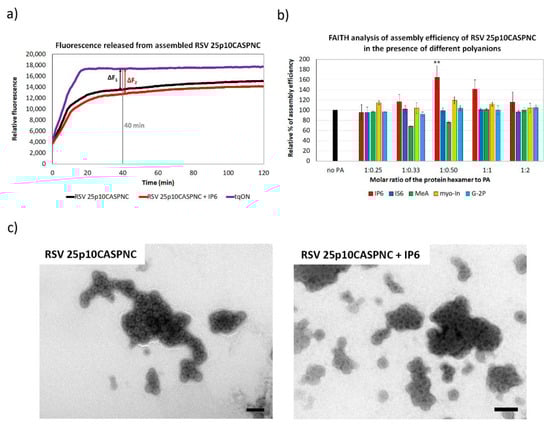 Similar to HIV-1, the RSV CA-CTD-SP region also adopts a helical conformation in immature particles [6]. In the HIV-1 hexameric lattice, this helical segment forms a six-helix bundle [3,19,45,46], which was also observed in RSV virus-like particles [6]. Based on this structural similarity, the RSV CA-CTD-SP region can represent a potential binding site for a small molecule that would enhance the assembly and stability of the immature particles. To analyze this possibility, RSV immature virus-like particles were assembled in vitro in the presence of various polyanions, including myo-inostol hexaphosphate (IP6), myo-inositol (myo-In), glucose-1,6-bisphosphate (G-2P), myo-inositol hexasulphate (IS6) and mellitic acid (MeA), and their impact on the assembly was analyzed by FAITH. RSV immature particles were assembled during overnight dialysis of RSV 25p10CASPNC protein in the presence of tqON in a range of concentrations of selected polyanions in RSV assembly buffer. The assembly efficiency was measured as an increase in fluorescence after the addition of ExoI and calculated from the formula E = 100 × ∆F2/∆F1, as was described above (Figure 2a). The only significant increment in RSV 25p10CASPNC assembly efficacy was observed for IP6. At the concentration ratio of protein hexamer to IP6 1:0.5, IP6 increased the assembly efficiency by 1.6-fold. In contrast, the other polyanions did not affect the assembly (Figure 2b). The shape and size of the particles assembled in the presence of IP6 were verified by TEM (Figure 2c).
