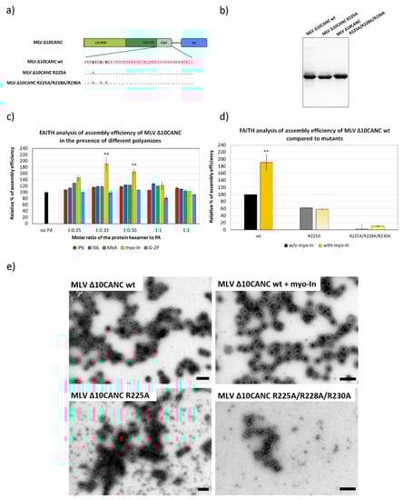 The efficiency of MLV ∆10CANCwild type (wt) and mutant proteins’ assembly in the presence of selected polyanions. (a) Schematic representation and amino acid sequence of MLV ∆10CANCwt and R225A and R225A/R228A/R230A mutants. (b) Coomassie blue-stained SDS-PAGE gel, documenting the purity of MLV ∆CANC wt and R225A and R225A/R228A/R230A mutants. (c) Percentage of assembly efficiency of MLV ∆10CANC wt protein in the presence of different concentrations of IP6 (red), IS6 (royal blue), MeA (green), myo-In (yellow) and G-2P (azure blue) at indicated ratios of protein hexamer to polyanions. p-values were assessed by ANOVA using the Tukey–Kramer test (**, p < 0.01). (d) Percentage of assembly efficiency of MLV ∆10CANC wt (black column), R225A (dark grey column) and R225A/R228A/R230A (light grey column) compared to the proteins assembled in the presence of 1.2 µM myo-In (yellow). p-values were assessed by ANOVA using the Tukey–Kramer test (** p < 0.01). (e) TEM analysis of negatively stained MLV ∆10CANC wt protein assembled in the absence or presence of myo-In at a final concentration of 1.2 µM (ratio of the protein hexamer to myo-In was 1:0.5) and both the R225A and R225A/R228A/R230A mutants in the absence of myo-In. Bars represent 200 nm.