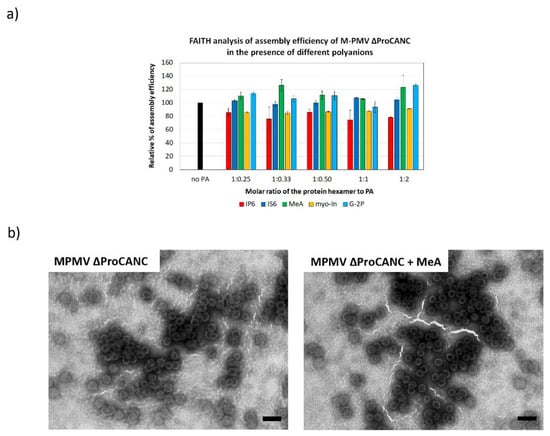 Efficiency of M-PMV ∆ProCANC wt protein assembly in the presence of selected polyanions. (a) Percentage of assembly efficiency of M-PMV ∆ProCANC wt protein in the presence of IP6 (red), IS6 (royal blue), MeA (green), myo-In (yellow) and G-2P (azure blue) at indicated protein hexamer to polyanions ratios. (b) TEM analysis of negatively stained M-PMV ∆ProCANC wt proteins assembled in the absence (left) and presence (right) of MeA (the final concentration of MeA was 0.8 µM and the ratio of the protein hexamer to MeA was 1:0.33). Bars represent 200 nm.
