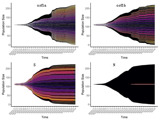 Temporal patterns of the diversity of nonsynonymous intra-host single-nucleotide variants (iSNVs) in four SARS-CoV-2 genes. Each fish plot represents the proportion of a specific nonsynonymous iSNV in the time interval covered by the samples. The dates indicate the days of sample collection.