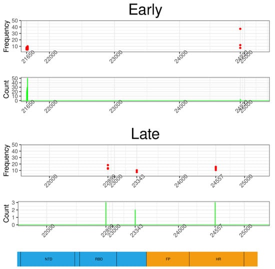 Genomic distribution of nonsynonymous iSNVs of two temporal groups in the S gene. Each dot represents the occurrence and frequency of a specific variant from Early and Late groups. The majority of iSNVs of the Early group are concentrated in a small genomic region starting at position 21,650; they have low intra-host frequencies but are shared by a significant number of samples. The variants of the “Late” group are observed at three positions, one of them localized in the receptor-binding domain (RBD); these mutations have higher frequencies but are shared by a small number of samples. The bottom of the figure shows a schematic representation of the S gene and its main domains: N-terminal domain (NTD), receptor-binding domain (RBD), fusion peptide (FP), heptad repeat (HR).