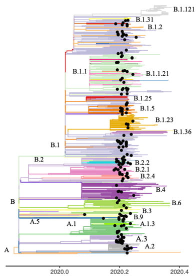 - Rambaut, A.; Lam, T.T.; Max Carvalho, L.; Pybus, O.G. Exploring the temporal structure of heterochronous sequences using TempEst (formerly Path-O-Gen). Virus Evol. 2016, 2. [Google Scholar] [CrossRef]