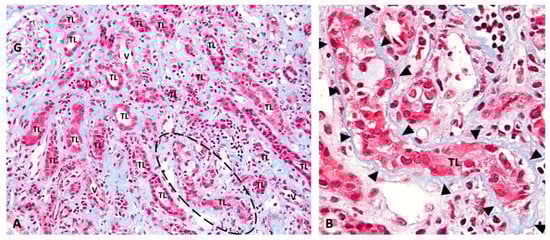 Renal injury in “definitive” PyVN. Renal biopsy: (A) low-power view of a representative case of PyVN demonstrating many tubular cross sections with virally induced injury. (B) The circled tubular cross section in “A” is shown at higher magnification. PyV replication causes marked injury to tubular epithelial cells with cell sloughing into tubular lumens (TL) and denudation of basement membranes. (A) Trichrome stain, 200× magnification. (G, glomerulus; TL, tubular lumen; V, blood vessel; dashed circle outlines a virally injured tubule). (B) Trichrome stain, 400× magnification (arrowheads, tubular basement membrane; TL, tubular lumen).