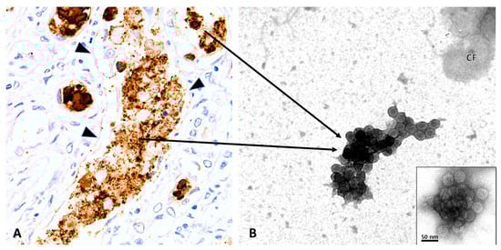 PyVN, intra tubular viral aggregation and urinary PyV-Haufen. Renal Biopsy (A) and Voided Urine Specimen (B). (A) Immunohistochemistry with an antibody directed against the PyV-VP1 capsid protein showing intra tubular viruses (brown) released into an injured tubule post host cell lysis. Note: denudation of tubular basement membranes. It is here that viruses form dense three-dimensional aggregates, seen as granules of varying sizes by light microscopy (LM). PyV aggregates are subsequently flushed out of the kidney and can be found in the urine as PyV-Haufen by negative staining EM. (B) EM showing characteristic PyV Haufen in a voided urine sample. These PyV Haufen can be easily identified based on the uniform size of the virions and the capsid surface structure (inset). Note the three-dimensional cast-like shape of the PyV Haufen (compare to Figure 4). (A) Immunohistochemistry on formalin fixed and paraffin embedded tissue sections with an antibody directed against PyV-VP1 capsid protein, 400× magnification; (arrowheads, tubular basement membrane; arrows, pointing from the “birthplace” of PyV aggregates to a typical PyV Haufen seen by EM in a voided urine sample in (B). (B) EM with negative staining/uranyl acetate stain, 80,000× magnification, transmission electron microscopy; inset with 120,000× magnification (CF, cell fragment).