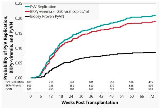 In the cohort of 81 patients with “definitive” PyVN, the diagnosis was established by biopsy, on average, 47 weeks post grafting (range: 3–320 weeks), with 64/81 (80%) of PyVN diagnoses established within the first 74 weeks. For this time window of 74 weeks after transplantation, Kaplan–Meier estimates are presented in Figure 5, with probabilities for overall PyV activation/replication, BKPy-viremia, and “definitive” biopsy-proven PyVN: probability of PyVN 9% (95% CI: 6.8–10.8%), probability of BKPy-viremia 19% (95% CI: 16.3–22.0%), and overall probability of any form of PyV activation/replication (decoy cell shedding and/or BKPy-viremia and/or “definitive” PyVN) 21% (95% CI: 18.2–24.1%).