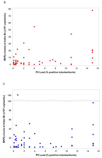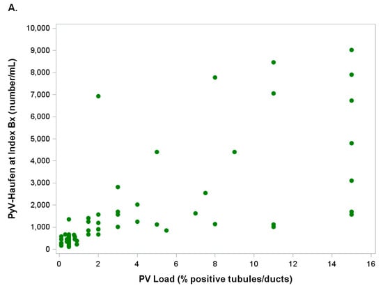 Scatter plots reflecting the relationship between quantitative test results of viremia, viruria, PyV-Haufen shedding and the Banff pv load (percentage of virally injured tubules) in corresponding biopsy tissue are illustrated in Figure 6A–C.