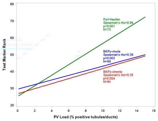 The overall significance testing was conducted using the Kruskal–Wallis test. Correlations were calculated using the Spearman Rank procedure. Due to the skewed nature of the PyV-Haufen and PCR data, ranks were determined for these values and used in the plots so that linear regression lines could be calculated. For the three PyVN disease classes, test marker results are shown as medians and interquartile ranges (IQRs).