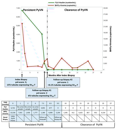 Viremia levels with a cut-off of 104 BKPyV copies (DNA gene equivalents)/mL plasma or greater have a higher positive predictive value for underlying “definitive” PyVN []. Conventionally, such viremia levels are considered “high risk” and classified as “presumptive” PyVN if additional confirmatory renal biopsy findings are lacking [,,]. Often without further confirmation by biopsy, immunosuppression in viremic patients is preemptively lowered in order to prevent disease progression and the (potential) development of “definitive” PyVN: one laboratory parameter, i.e., plasma PCR data, guides therapeutic intervention, i.e., the lowering of immunosuppression.