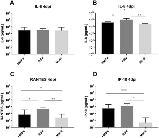 Cytokine induction by RSV and HMPV in in vitro reconstituted airway epithelia. IL-6 (A), IL-8 (B), RANTES (C), and IP-10 (D), levels were measured 96H post-infection with RSV or HMPV in daily collected basal medium using ELISA. Statistical significance was calculated using the two-way ANOVA, N = 4. *** p < 0.001;** p < 0.01; * p < 0.05.