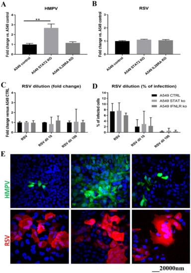 HMPV but not RSV replication increased in A549 cells in the absence of STAT1. A549 CTRL, STAT1 KO, and IL-28RA KO were infected by RSV and HMPV (MOI around 0.04). The percentage of HMPV (A) and RSV (B) infected cells was represented relative to A549 CTRL. RSV replication was also determined from A549-derived cells infected with RSV as in A and B and diluted 10 and 100 folds were represented in fold change relative to A549 CTRL from each inoculum concentration (C) and in the percentage of infected cells (D). (E): Confocal microscopy images of A549-derived cells infected with HMPV (green, upper panel) and RSV (red, lower panel). Nuclei were stained by DAPI (blue). Statistical significance calculated using two-way ANOVA, N = 4, was shown (** p < 0.01).