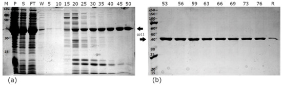 Metal-affinity purification of the gp11 protein from cell lysate. SDS-PAGE gels show the early- (a) and late- (b) eluting fractions. Although the late-eluting fractions appeared to contain a single species, size-exclusion chromatography was used as a second purification step to increase the purity. Column labels: M—molecular weight standard; P—pellet (insoluble material from cell lysis); S—soluble material from cell lysis; FT—flow through from Talon resin binding, showing a protein that did not bind to the resin; W—10 mL wash of resin. Numbering references the fractions eluted from the column: 5 µL of cell lysate fractions (P, S, FT) and 10 µL of each fraction was loaded in each lane; R—residual protein remaining bound to the Talon resin, determined by mixing SDS dye with 10 µL of suspended resin.