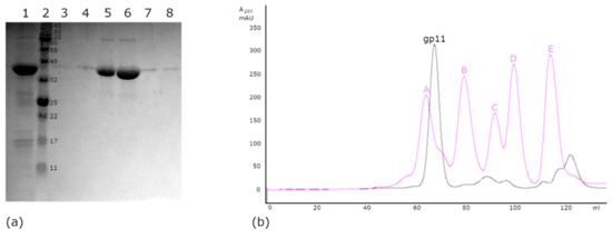 (a) SDS-PAGE gel from gel-filtration purification of gp11. Lane 1: starting material, concentrated protein from the metal-affinity column that was loaded onto the S200 column. Lane 2: molecular weight marker, with weights indicated in kilodaltons. Lanes 3–8: Sequential, 1.4 mL elution fractions of the single gp11 peak from the S200 column. Fractions 42 (58.8 mL)–47 (65.8 mL). (b)Typical elution profile from a Superdex 200 (16/60) gel filtration column for gp11-containing fractions combined after metal-affinity purification. Magenta overlay is the elution profile of a standard protein mixture over the same flow rate conditions. The standards are (A) thyroglobulin (670 kDa); (B) γ-globulin (158 kDa); (C) ovalbumin (44 kDa); (D) myoglobin (17 kDa); and (E) vitamin B12 (1.35 kDa).